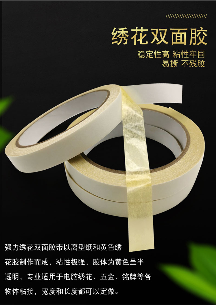 2、無基材雙面膠具有優(yōu)良的粘合效果能防止脫落而且防水性能優(yōu)異,加工性能好、耐溫性能好,短期可耐溫達(dá)到204-230℃,一般長(zhǎng)期耐溫達(dá)到120-145℃,厚度一般大約為0.05-0.13MM,適合于銘板、面板、裝飾件的粘接。